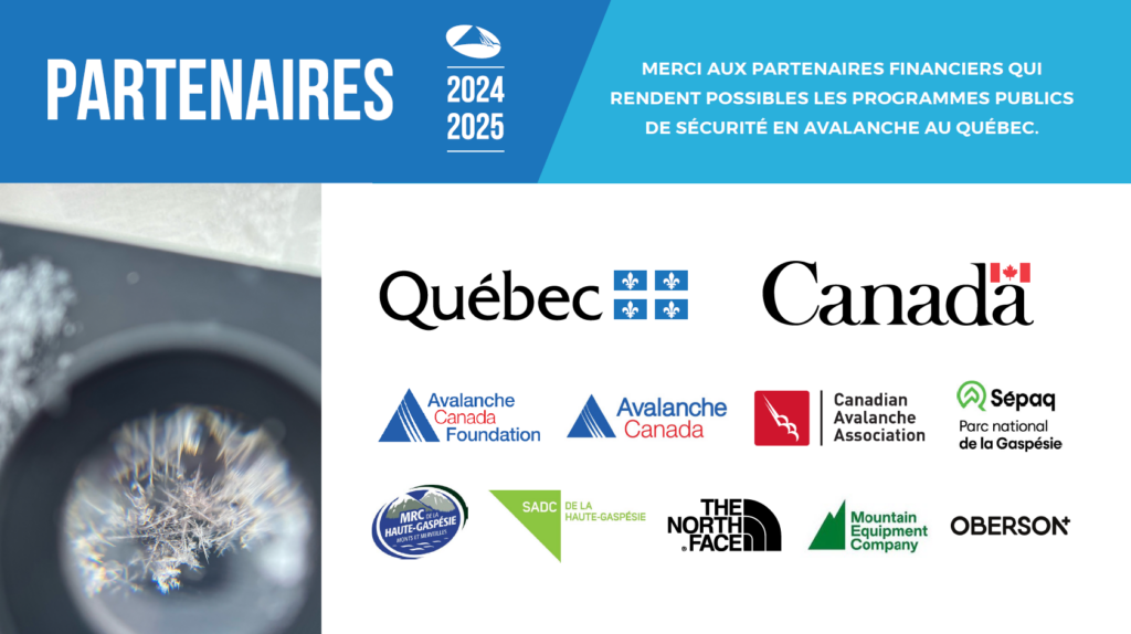 À propos de nous: Avalanche Québec est un organisme à but non lucratif dédié à la sécurité en avalanche au Québec. Ce programme unique dans l’est du pays a été initié à l’automne 1999 par la MRC de la Haute-Gaspésie. Il a ensuite été développé au cours des années suivantes avec le soutien de nombreux partenaires de différentes sphères.