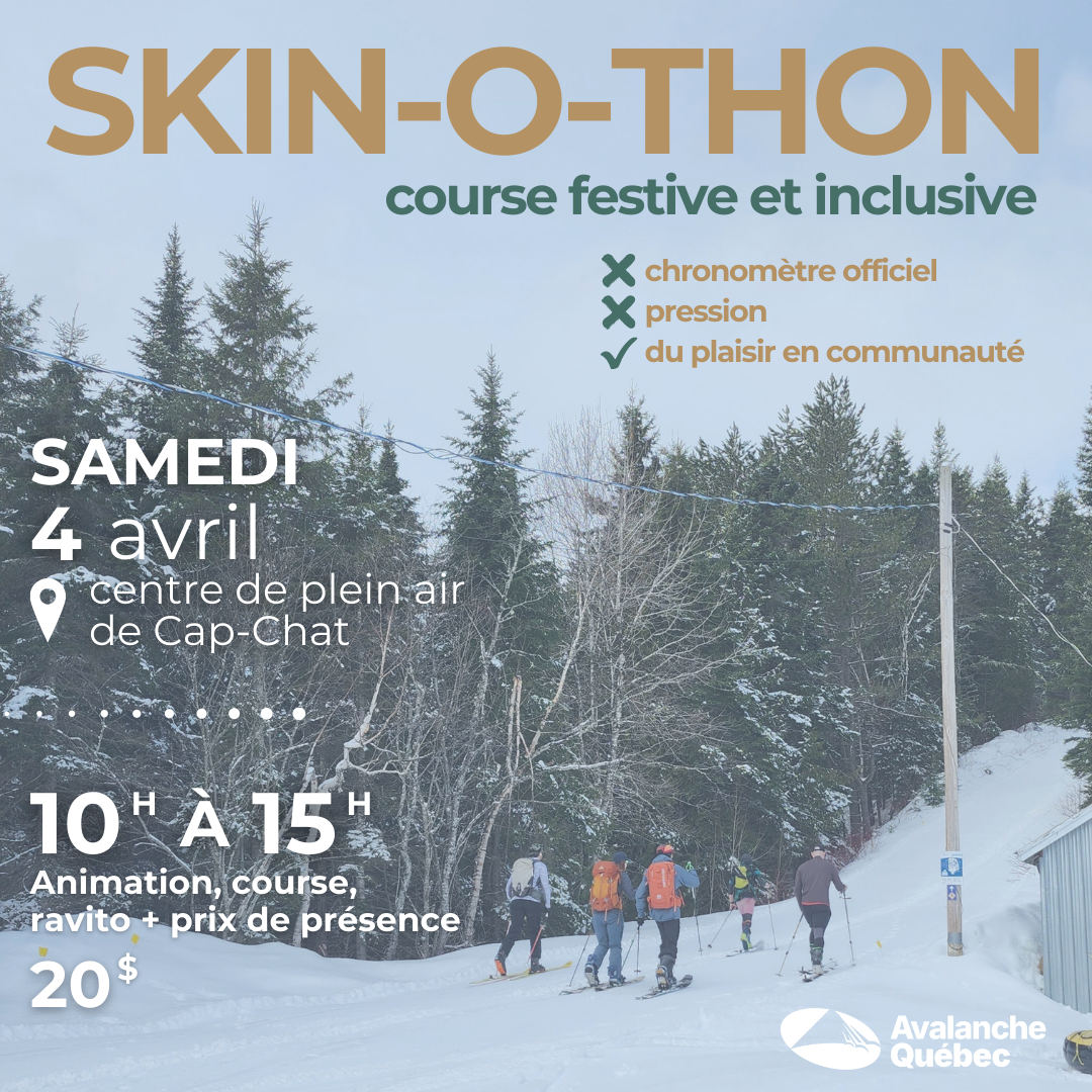 Le printemps arrive et avec lui une belle occasion de se rassembler en montagne. Le samedi 4 avril 2026, Avalanche Québec vous invite au Skin-o-thon, une course festive et inclusive au Centre de plein air de Cap-Chat.
