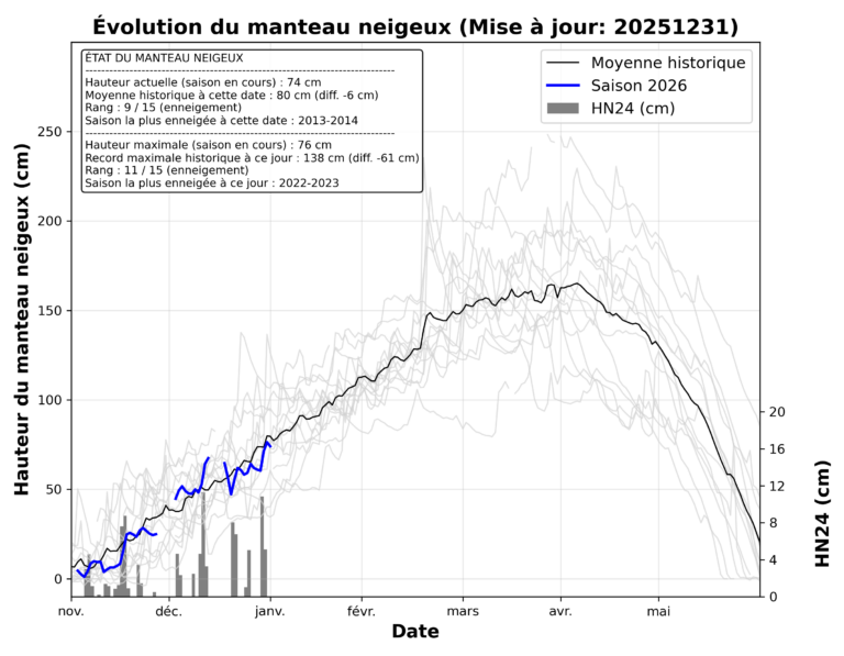 - Hauteur du manteau neigeux à mi-montagne : 74 cm