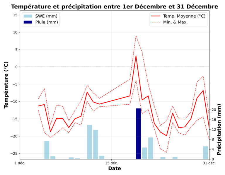 Le mois de décembre 2025 est beaucoup mieux accueilli que celui de la saison dernière, qui avait apporté plus de 40 mm de pluie en montagne. Malgré tout, cette tendance aux redoux et aux précipitations semble se confirmer dans nos bases de données historiques et illustre bien les effets des changements climatiques.