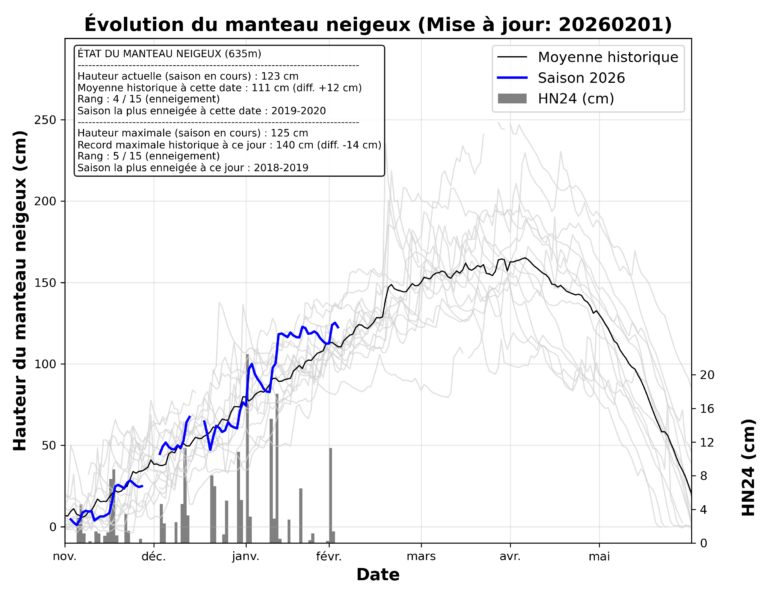 Il faut remonter à 2022 pour trouver un mois de janvier se terminant avec plus de 123 cm de neige à mi-montagne ! Durant ce mois, deux cycles de tempêtes ont apporté respectivement 27 cm et 44 cm de neige. Grâce à ces événements, les chutes de neige de janvier 2026 dépassent notre moyenne historique de 20 cm, ou un bon powgouin pour les connaisseur·euses 😉.